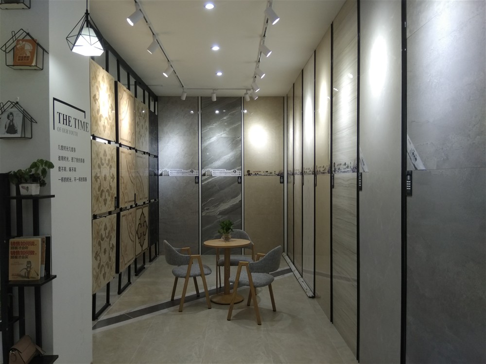 这是选采取也是洽谈区,产品选用直板展现方式,简洁、直观,灯槽照射下的产品纹理明显。