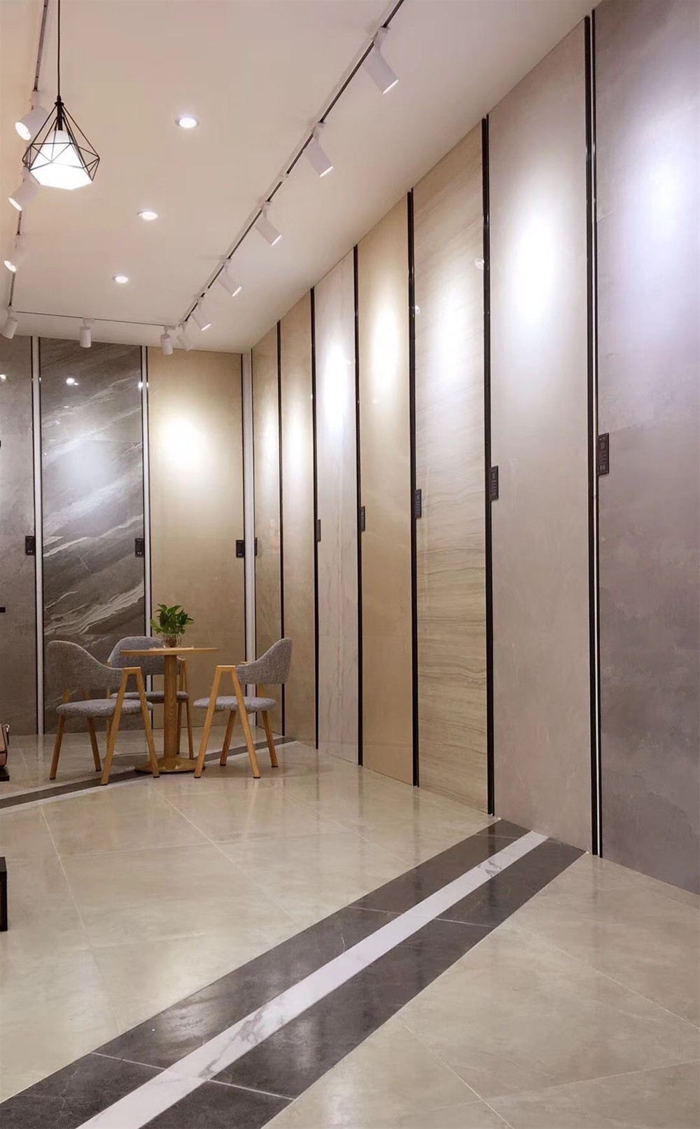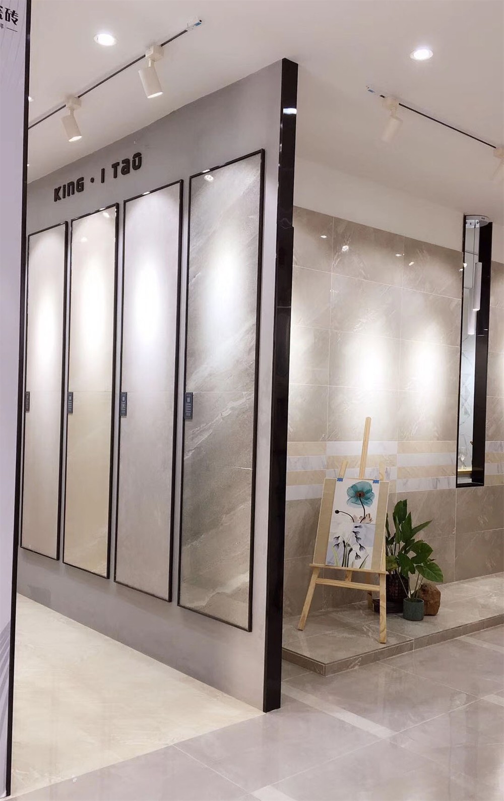 这是缎光釉卡拉卡白铺贴的形象墙,白色的基调让空间看起来宽敞明亮,灰色大纹理散发着优雅的气息。