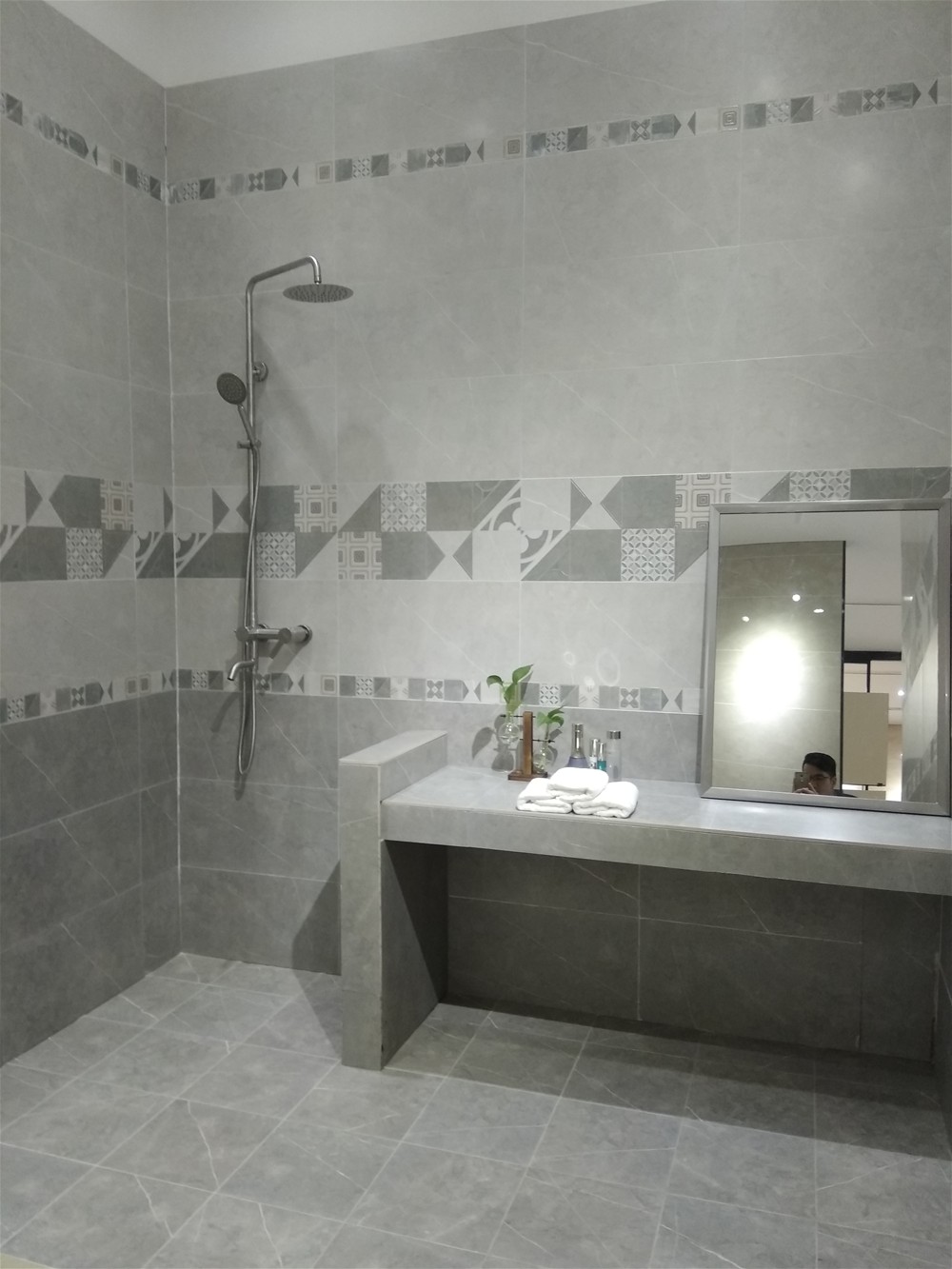 这是卫生间模拟间,瓷砖选用激情AV青青草陶喷墨瓷片,上墙下地都能铺,颜色是今年流行的灰色调,一深一浅搭配出层次感,也不至于单调。这款瓷片也可作厨房用砖。