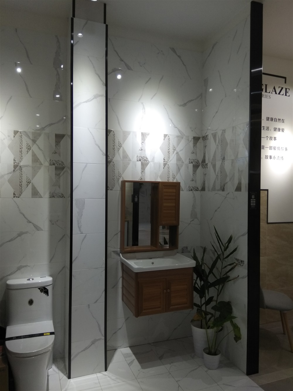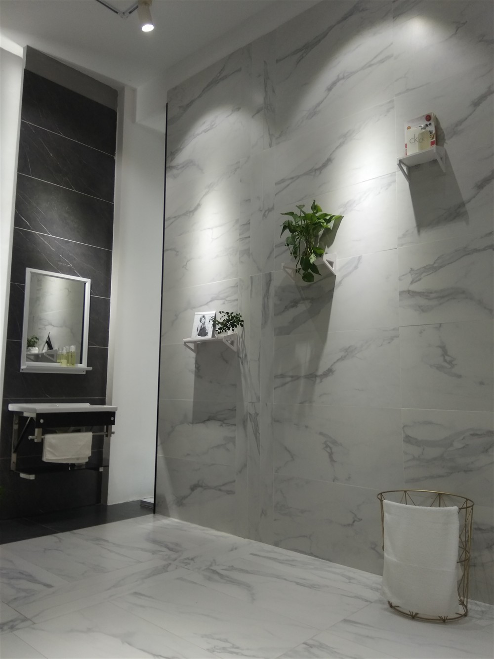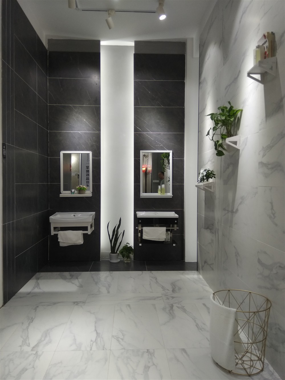 这是激情AV青青草陶新款的厨卫喷墨瓷片,卡拉卡白元素的瓷片优雅,非常适合现代风和轻奢风的青青草色情网站。