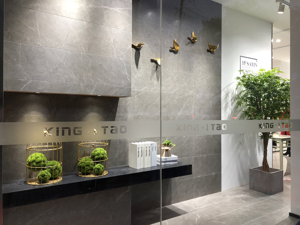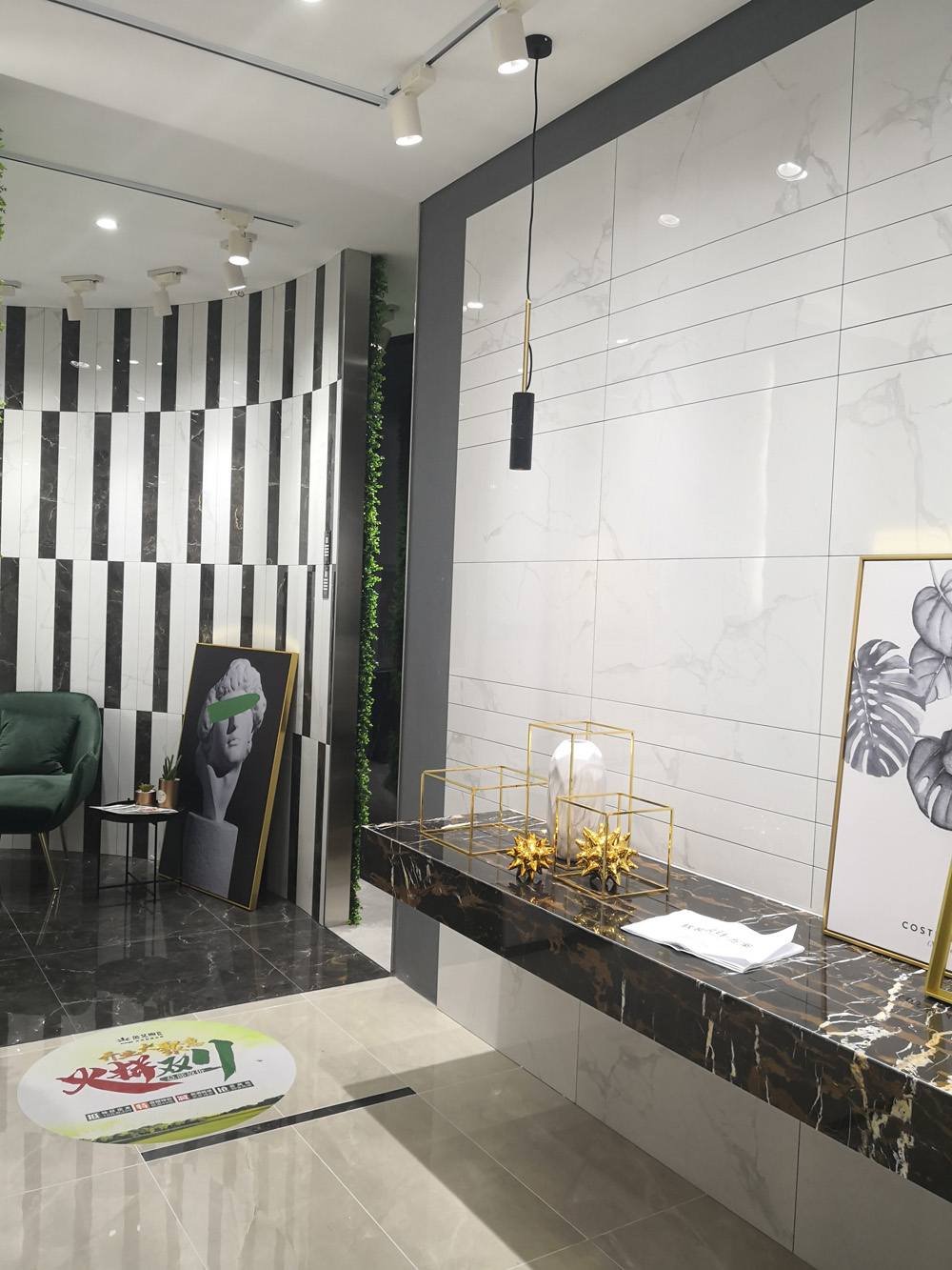 这是激情AV青青草陶浙江嵊州青春馆的前台,由灰色九面通体大理石铺贴的背景墙,形象台由缎光釉卡拉卡白铺贴而成,可塑性非常强的一款产品。简洁大气的前台延续了青春馆的现代简约风格。