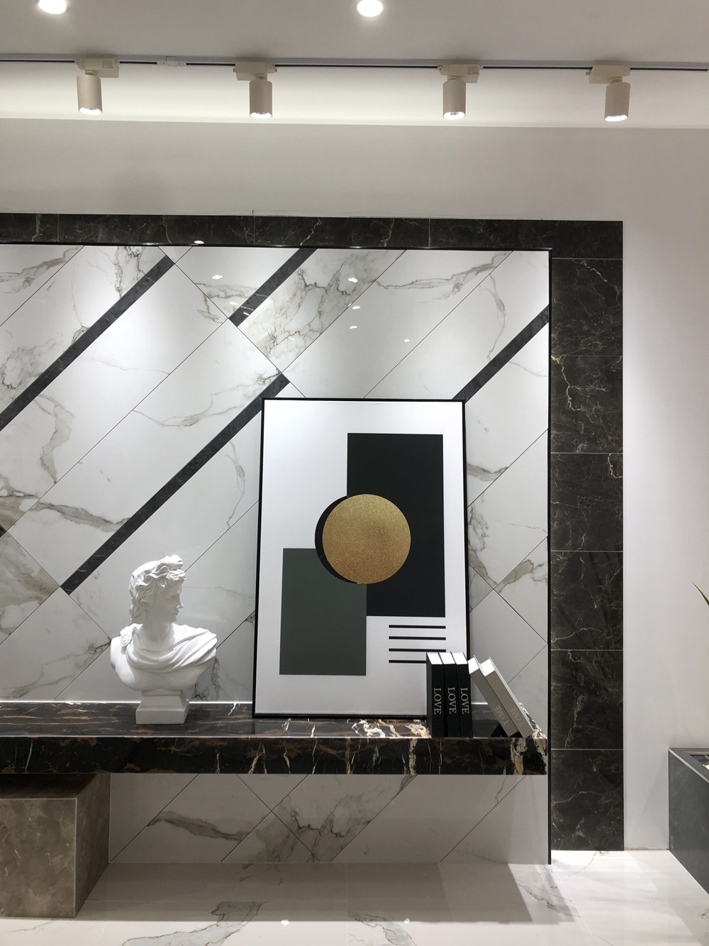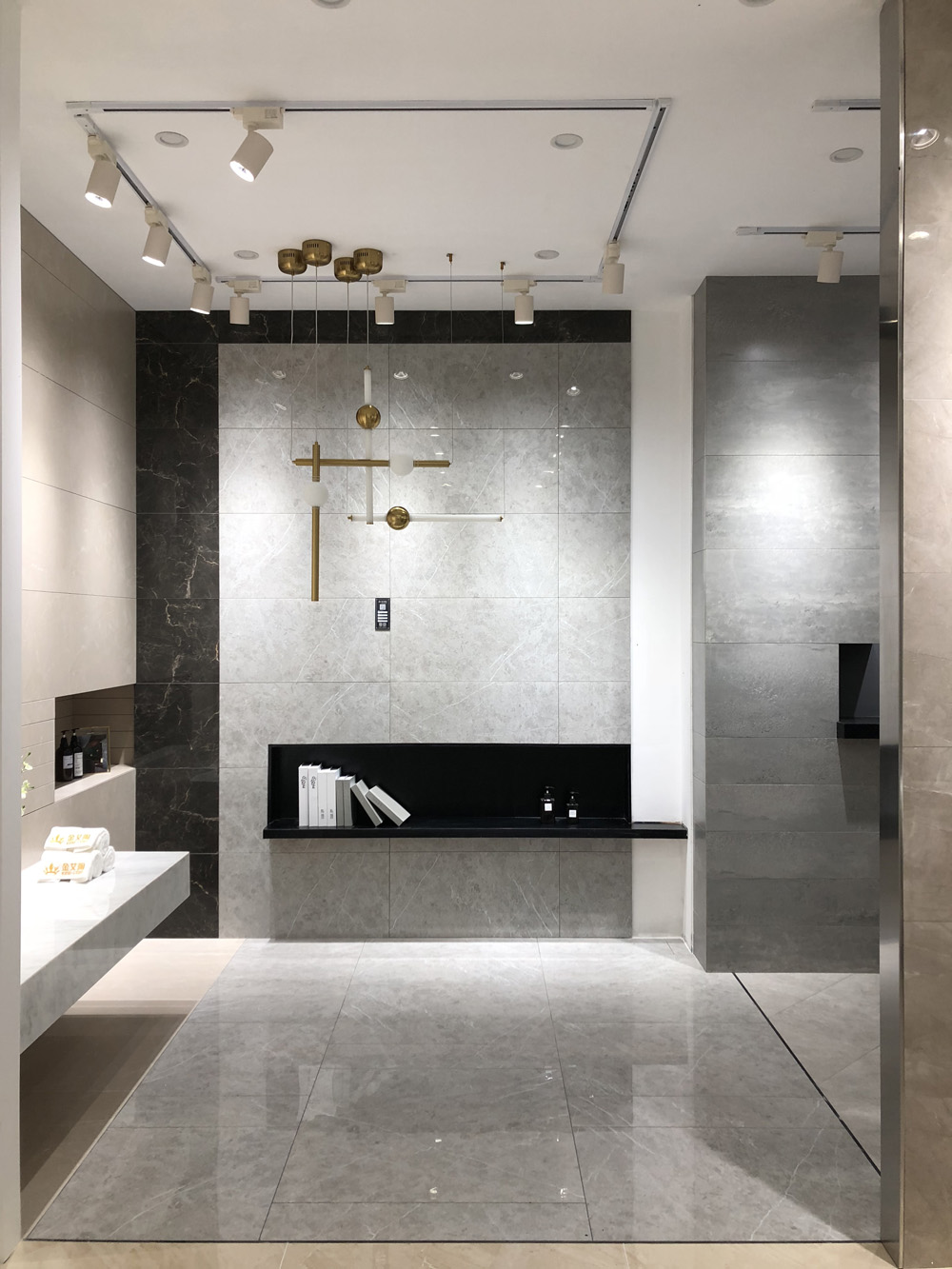 这是选材区,产品选用直板展现方式,简洁、直观,地面选用九面通体大理石鱼肚白进行铺贴,白色地面能更好地突出其它产品的颜色和纹理,加之槽灯照射,呈现产品逼真自然的纹理。