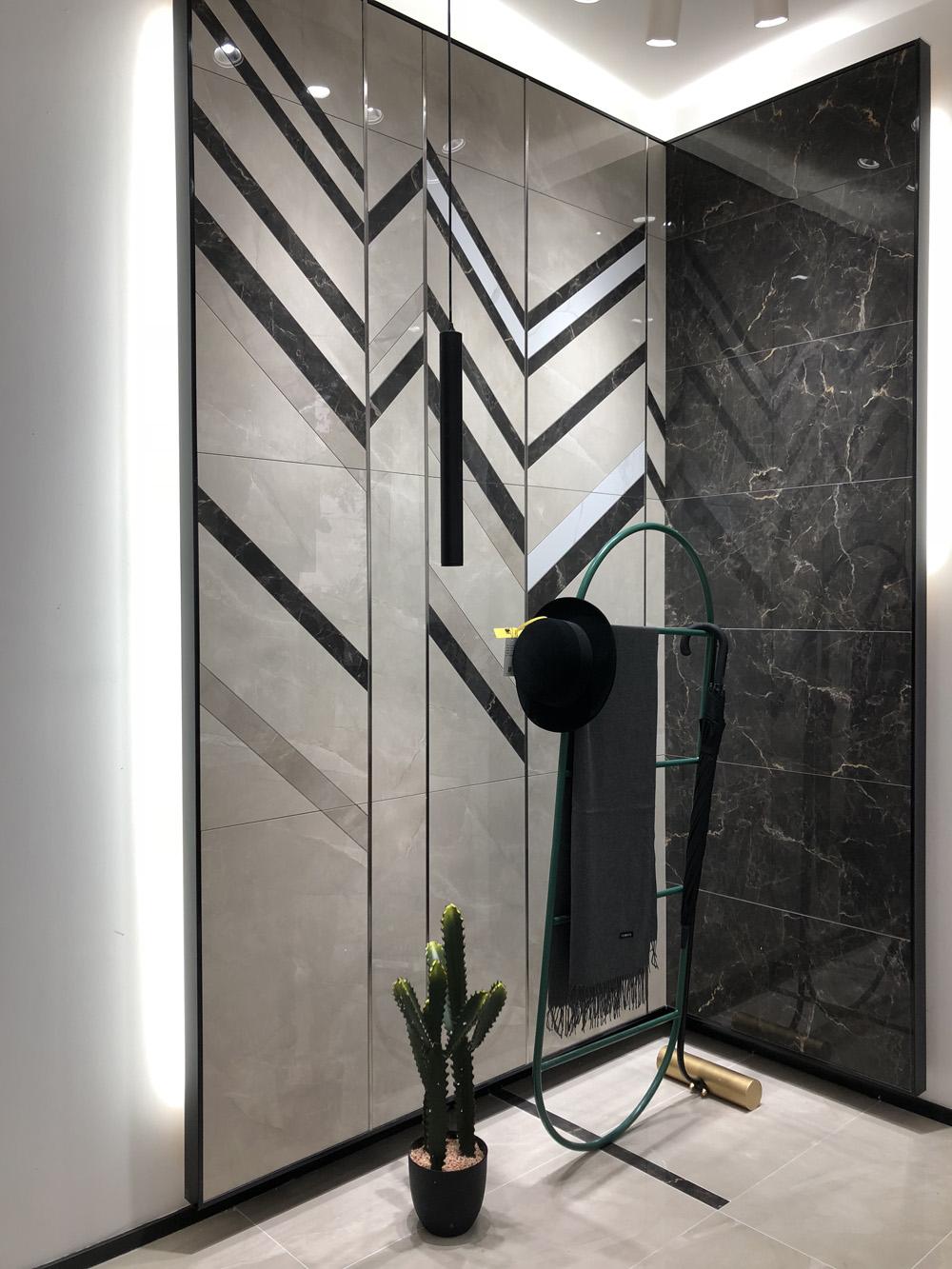 这是由缎光釉铺贴的电视背景墙、书房等,不同深度的灰色拼接搭配出简约时尚的空间。