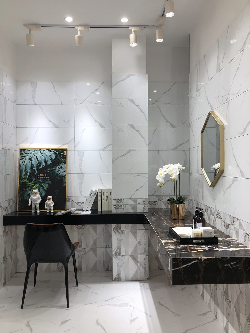 这是轻奢风格阳台、书房的模拟间,由通体大理石铺贴的墙面个性艺术,搭配金属软装营造出轻奢的质感。现在很多流行的咖啡厅参照这样的设计来吸引消费者。
