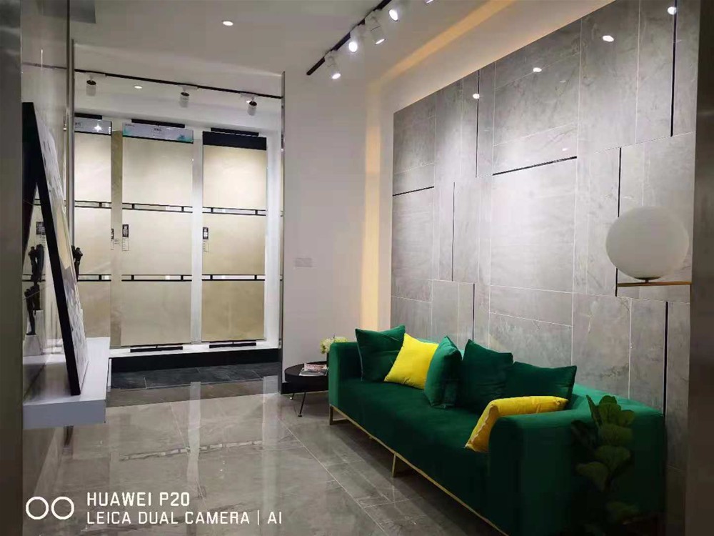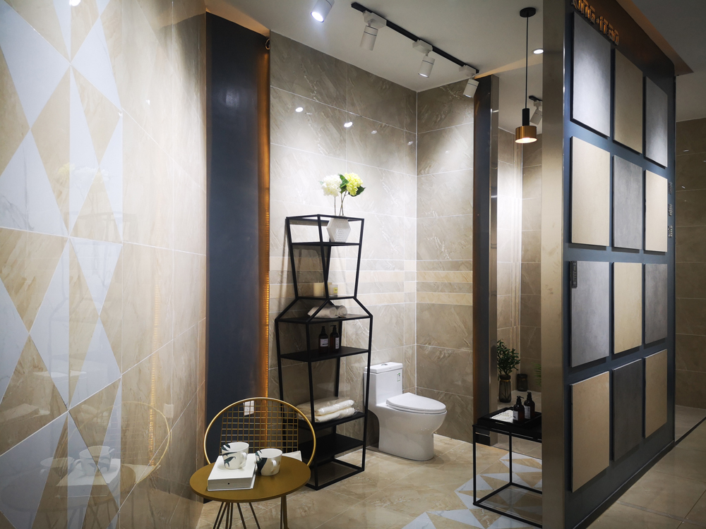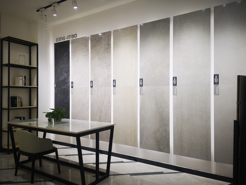 这是选材区,打竖的陈列方式射灯下的产品,直观、整洁、大气、很好地凸显产品的纹理,推拉陈列方式主要针对喷墨瓷片,简单一堵墙就能把喷墨瓷片的搭配、铺贴、风格直观呈现。