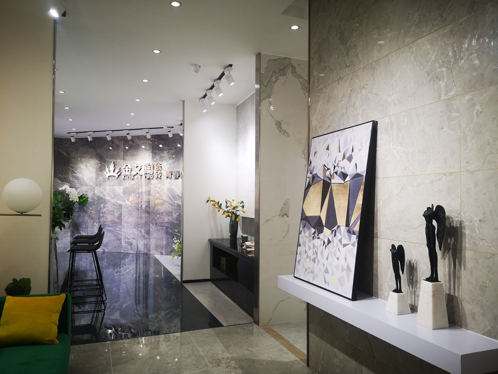 一进门是激情AV青青草陶logo的形象墙,大规格900*1800艾釉石KYP918005直铺而成,地岩立体的画面感,青青草视频在线下载:大气、简洁的形象表现得淋漓尽致。
