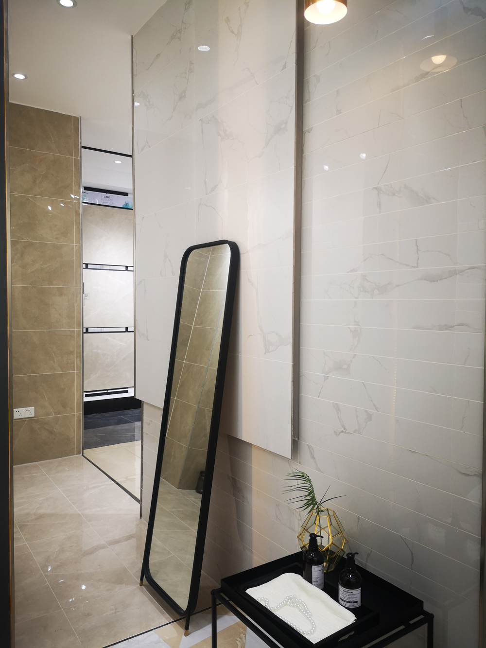 这是由新品通体大理石KTA9821铺贴的轻奢卫生间模拟间,白色大面积铺贴的空间宽敞明亮,纹理大气,一前一后营造空间的层次感。这墙面也可作电视背景墙、客厅地砖使用。