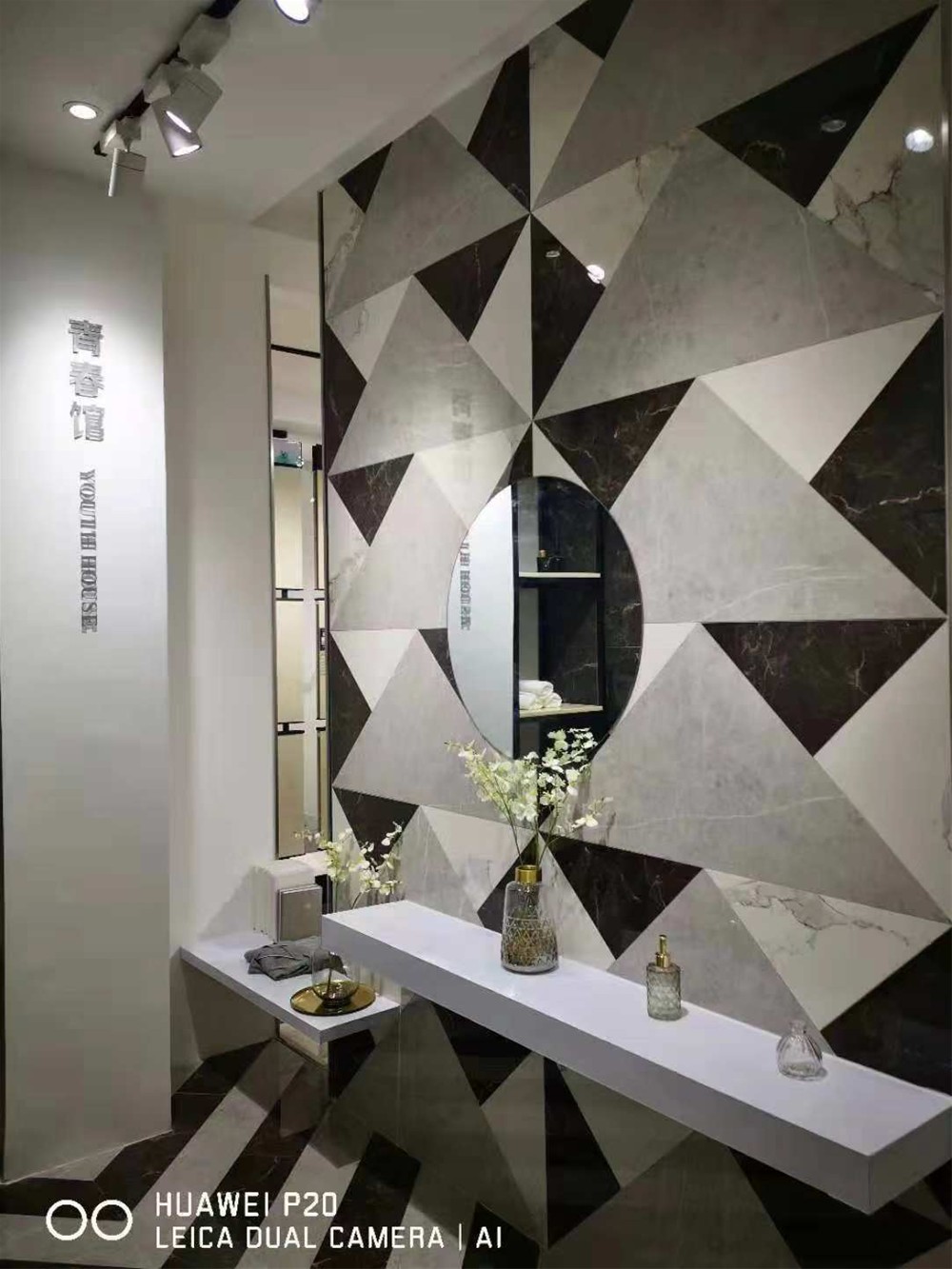 这是是由通体大理石KTA9817、KTA9818、KTA9819不同颜色不同规格三角形组合铺贴的卫生间,打破传统的卫生间铺贴,搭配纯白色的台面,一繁一简搭配不会产生审美疲劳。
