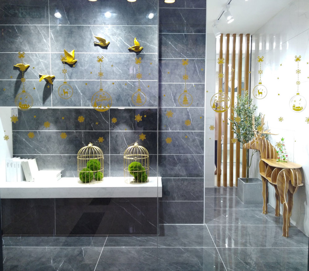 从外立面的橱窗就能看到激情AV青青草其中一个模拟间设计,这是由九面通体大理石KB9M61208卡门深灰单独铺贴,深灰色瓷砖搭配金色软装营造出神秘、沉稳、轻奢的空间氛围,这款瓷砖铺贴客厅地面,电视背景墙等地方同样适合。