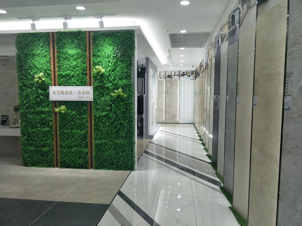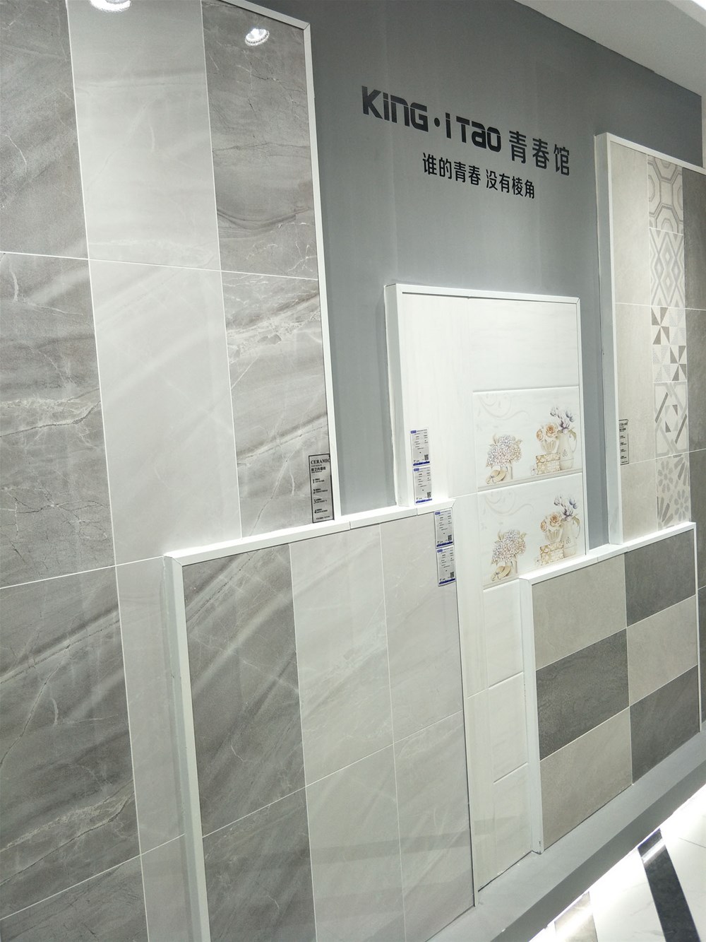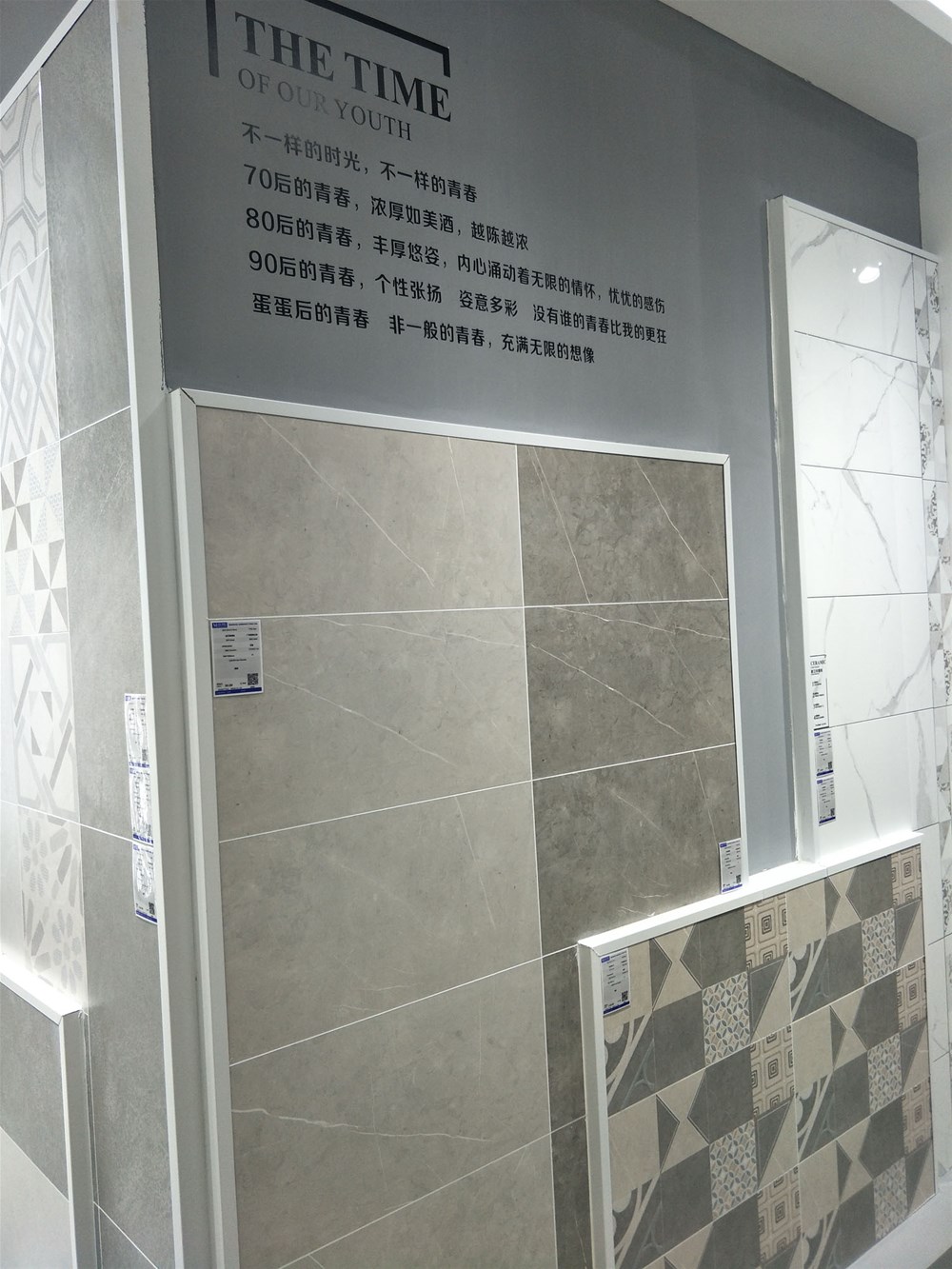 这是激情AV青青草配套喷墨瓷片的展示墙,花片、小地砖、腰线、瓷片一应俱全,厨房、卫生间、阳台等空间都适用,让你完全省掉了搭配的麻烦。