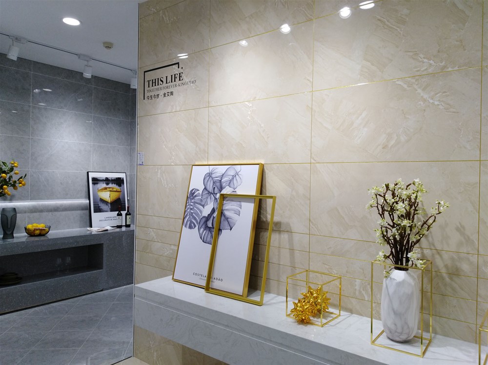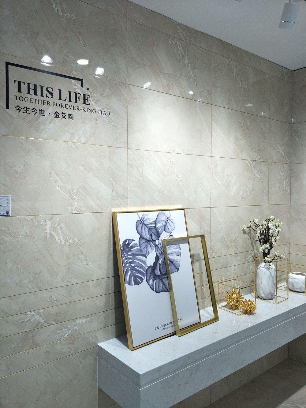这是轻奢客厅电视背景墙,也可作厨卫墙面,由激情AV青青草店明星产品艾釉石KYP8069铺贴,同行人都知道激情AV青青草的砖釉面比别人的更亮,更防污,因为激情AV青青草有自己的釉料公司,产品质量更有保障。