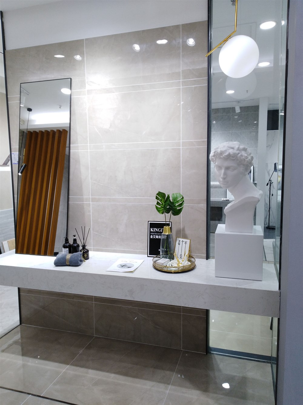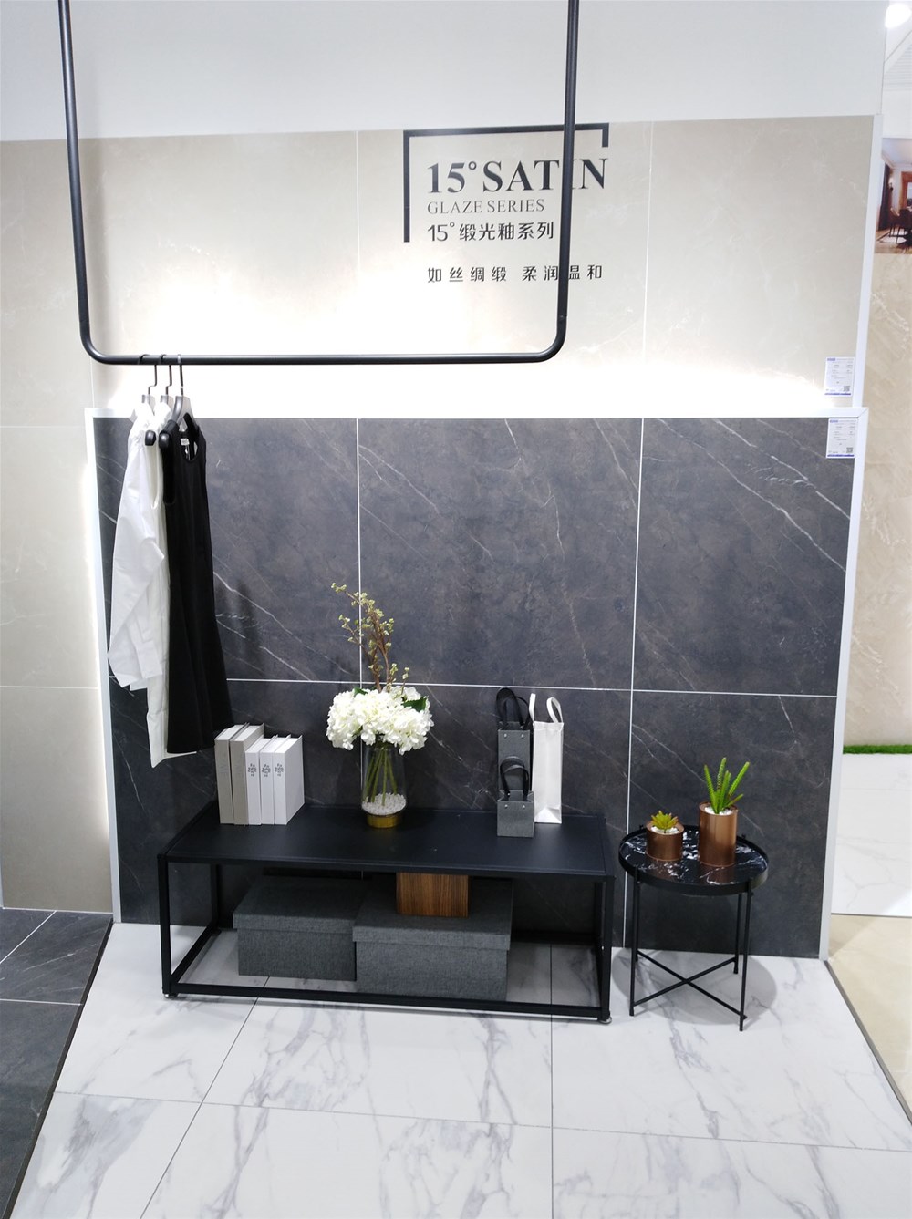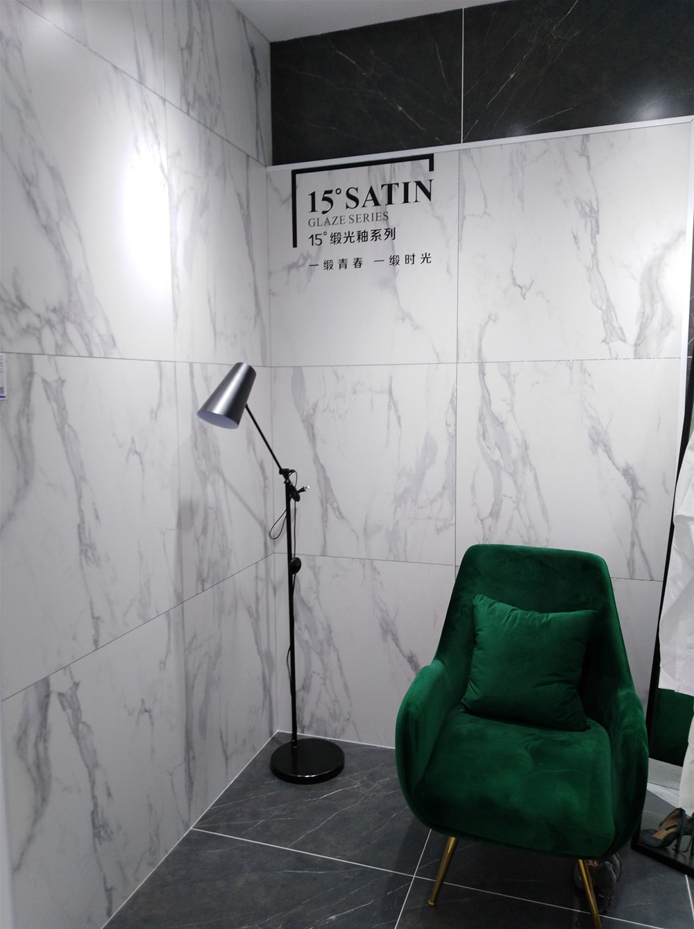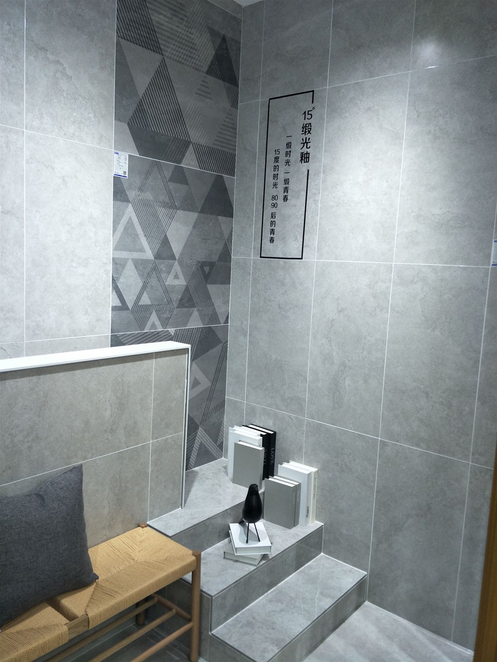 这是由15°缎光釉KFD8801卡拉卡白和KFD8808保加利亚灰搭配铺贴的书房、阳台或是休闲区的模拟间,一深一浅,一前一后,大纹理与小纹理的搭配,让观者有视觉的冲击力,不会产生审美疲劳。