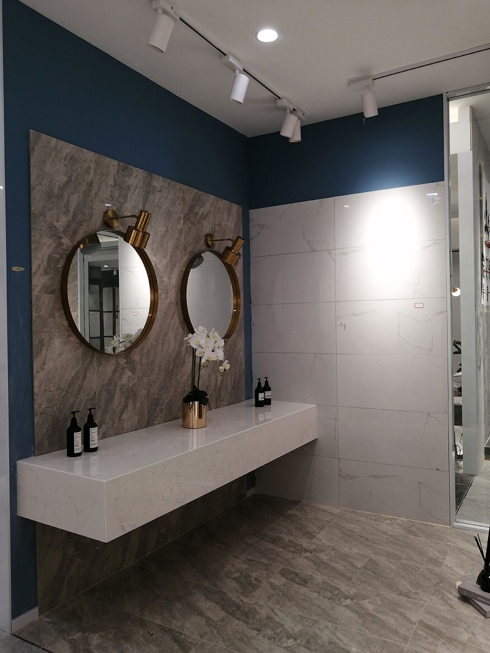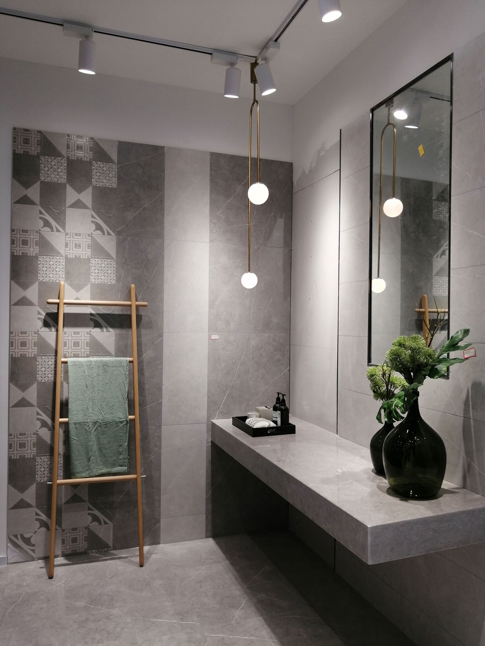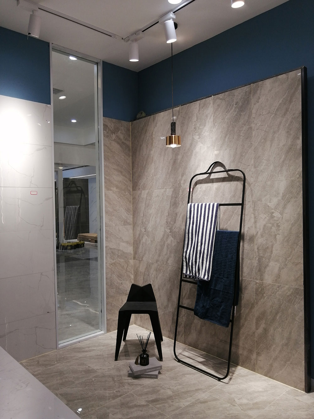 通体大理石玛雅灰KTA8301铺贴,整个空间以灰色作为主色调,灰色是最近家装最流行的颜色,自带高贵与品味,优雅沉着,砖面纹理大胆粗犷,营造沉稳大气的空间氛围,墙面与地面选用同款产品,营造空间协调统一的空间。