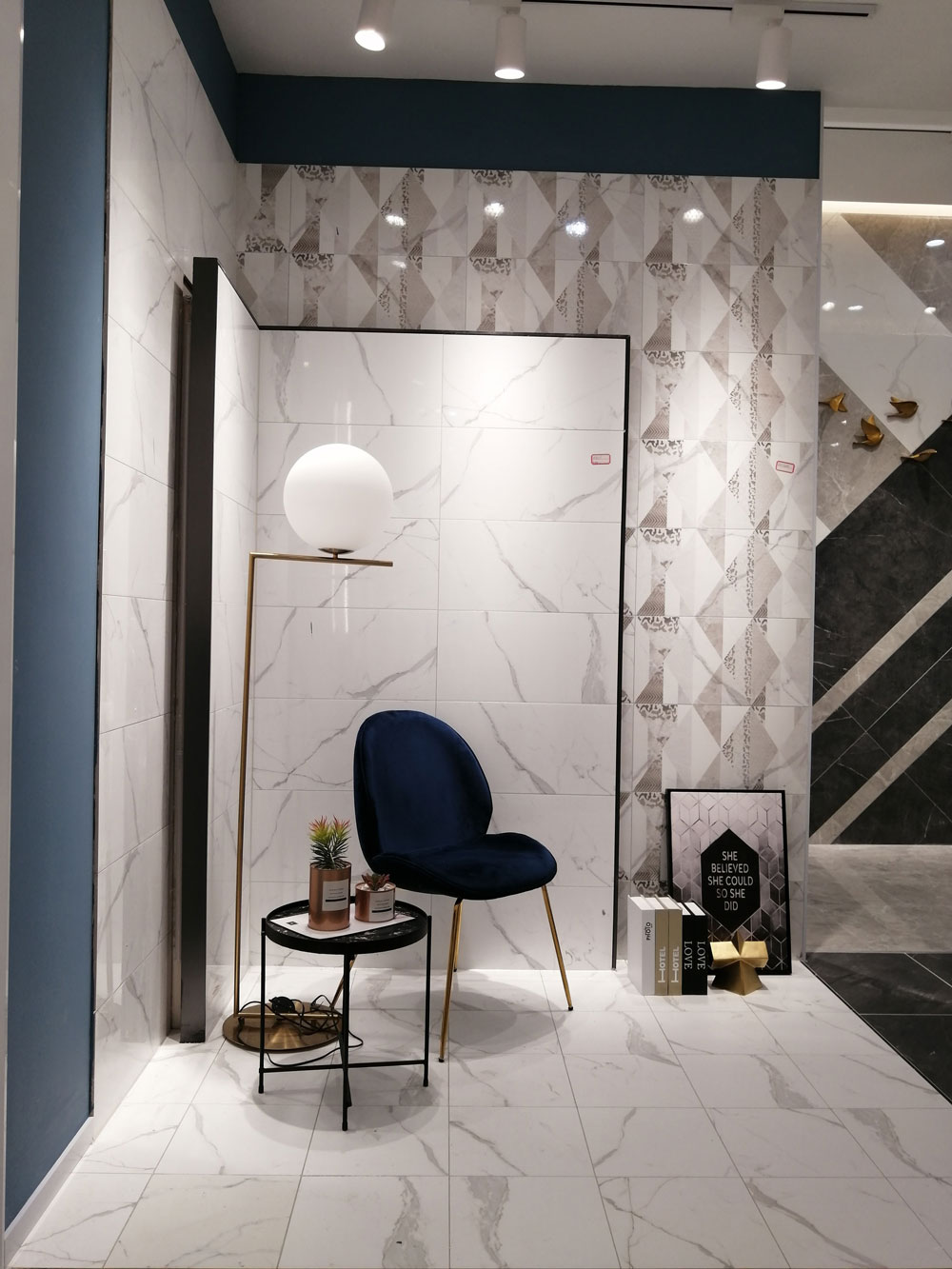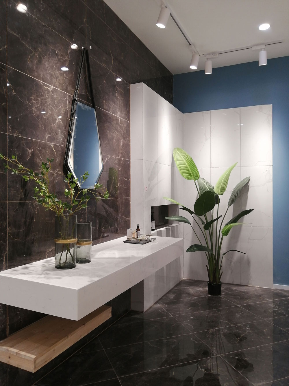选用的是600*1200规格的通体大理石达曼深咖KTB9818/鱼肚白KAM61213,墙面的深咖色与地面的白色相呼应,营造了一种现代极简的空间感,台面上的白色加深咖色的相框让整个空间的底层白色与上层深咖色过渡的非常自然,使整个空间显得十分统一。