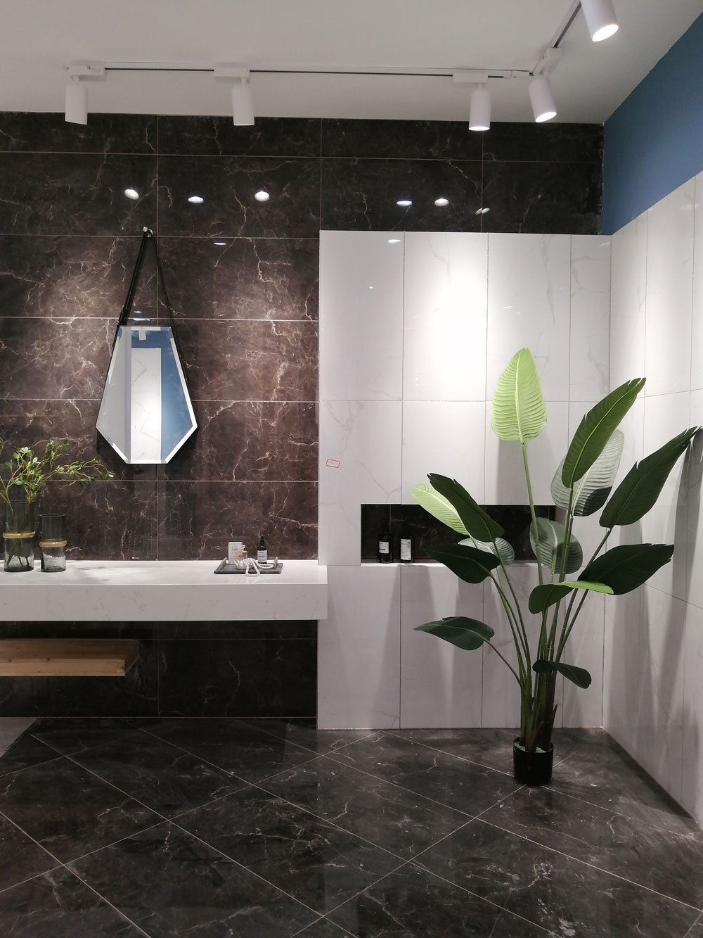 通体大理石达曼深咖KTB9818/雪花白KTA9821切割成400*800铺贴,墙面与地面选用同一款砖,营造和谐统一的空间氛围,右边墙面选用白色瓷砖铺贴,使得整个空间层次分明,绿植点缀的空间尽显生机与活力。