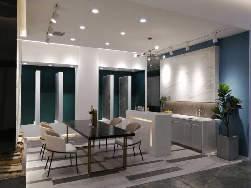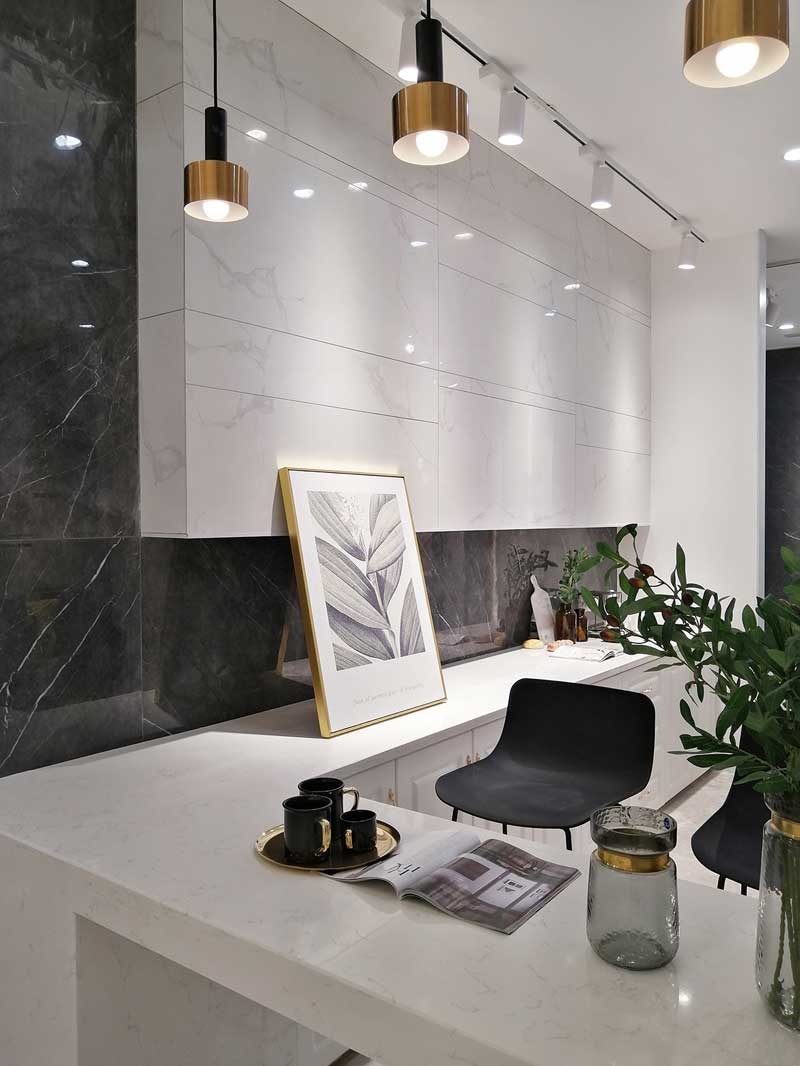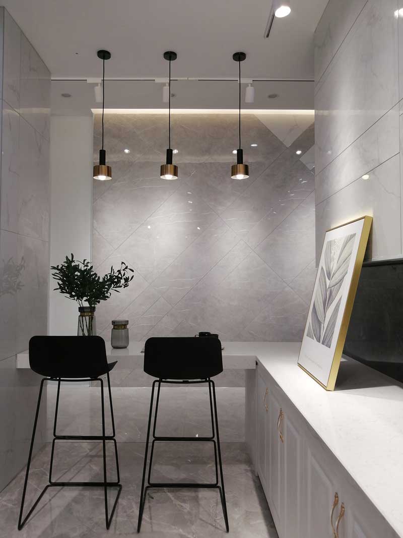 墙面:厨房墙面-KFD126A01卡拉卡白、餐厅墙面-KFD126A09伦敦黄