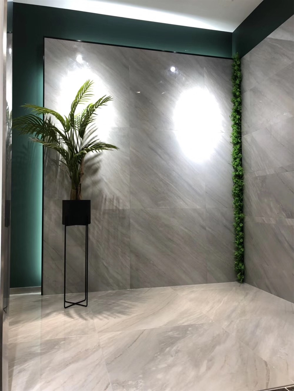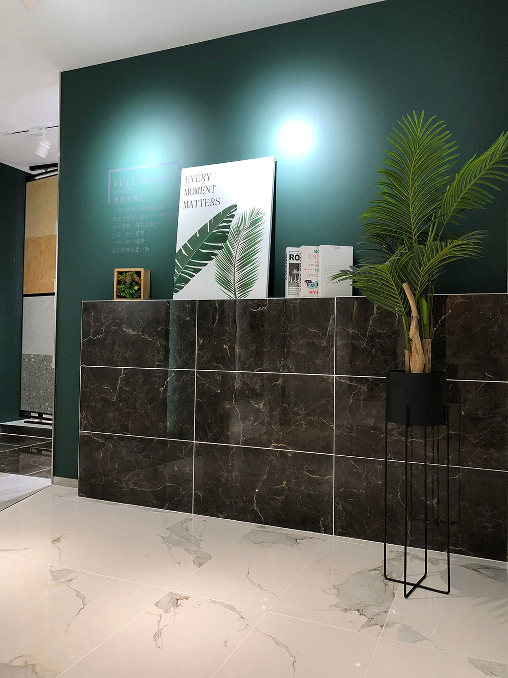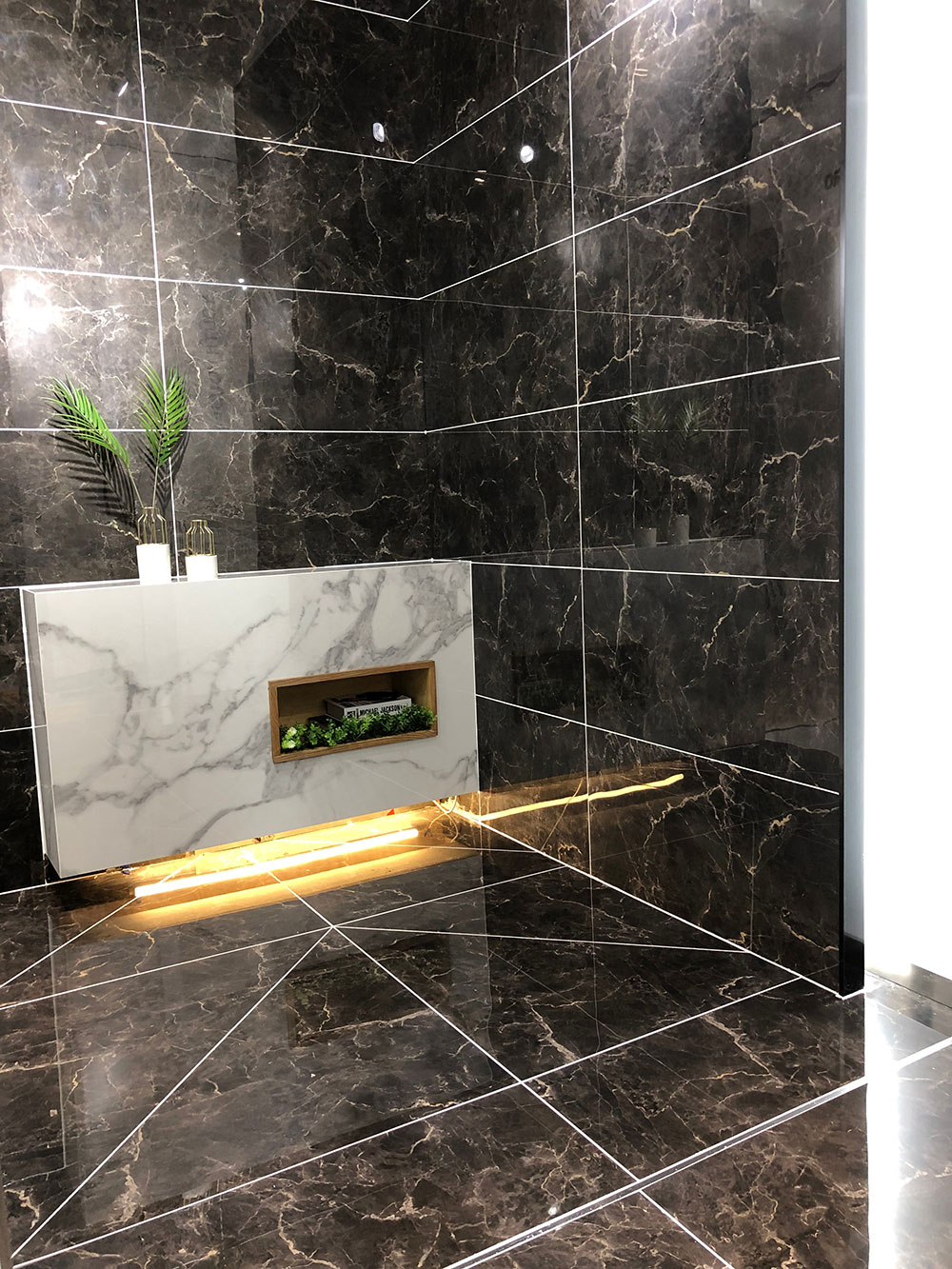 这是激情AV青青草的前台,背景墙由灰色通体大理石KA9M009罗马布里卡通铺,把木纹条作为空间的间隔,前台选用白色镶嵌银色大理石纹,整个空间散发着简洁优雅的气息。凸显简约的青青草视频在线下载定位。您家地砖和背景墙同样适合选用这款砖。