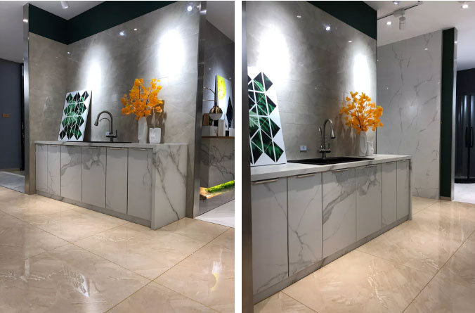 这是现代简约风格厨房,墙面由艾釉石KYP8118通铺,地面由KYP8069格兰石通铺,米黄色与浅灰色搭配形成对比,给人视觉上强烈的冲击力。