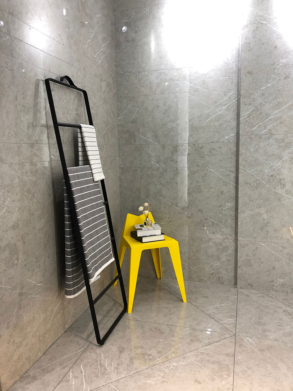 这是由通体大理石KTA9819卡门灰铺贴的衣帽间,整个空间以灰色作为主色调,灰色是百搭色,软装选用黄色,墙面凹凸有致,营造视觉冲击力,灰色作为近几年的家装主流色,运用于电视背景墙、全屋地面都是不错的选择。