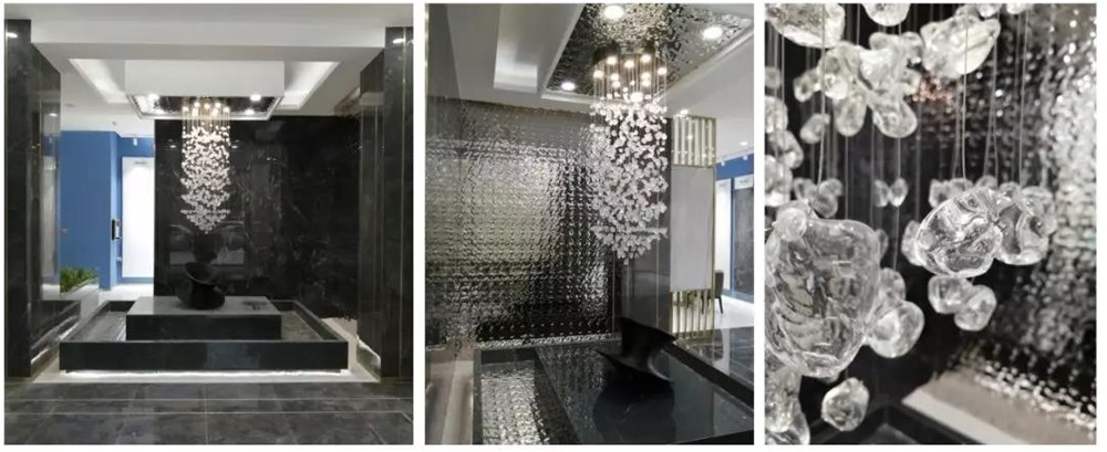 入口大堂入眼就是一个中央景观形象区,选用黑色的大理石搭配晶莹剔透的瀑布水晶灯,璀璨夺目,高级感一下子提升上来