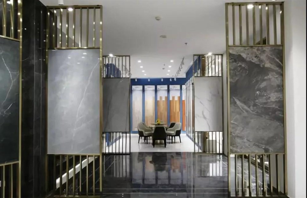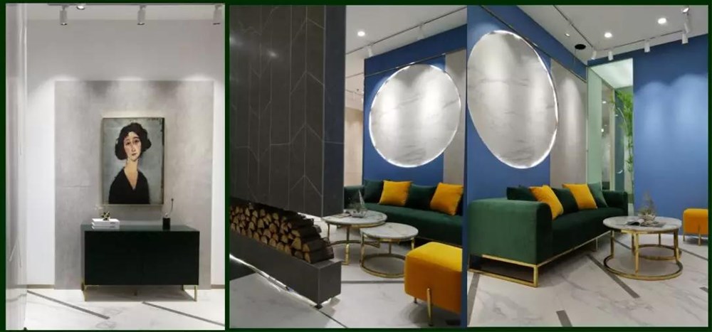 800*800样板展示区,以色彩置为参照圆点,延伸出了以雪白而略带灰度的空间基底,带有肌理感的瓷砖样板,用颜色和亮度的不同,区分空间的层次;结构线条和香槟金钢条阵列相间,对于金属纽带的回应,穿插在空间的每一个小细节中;