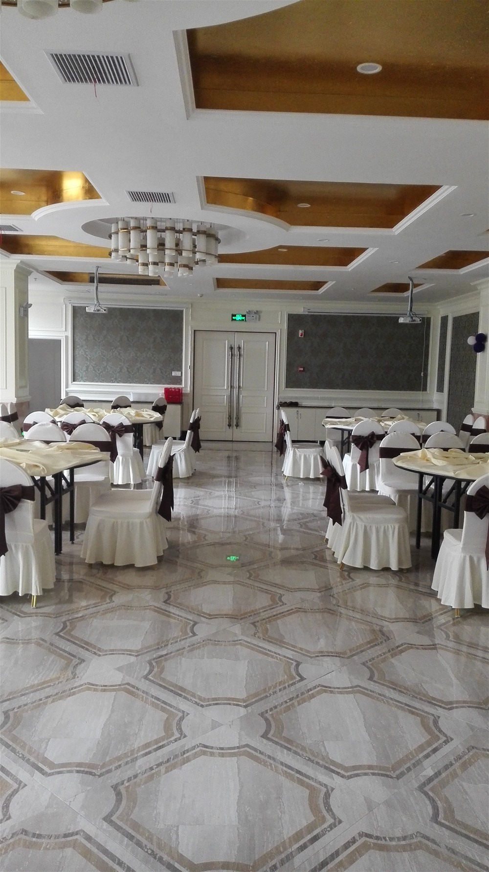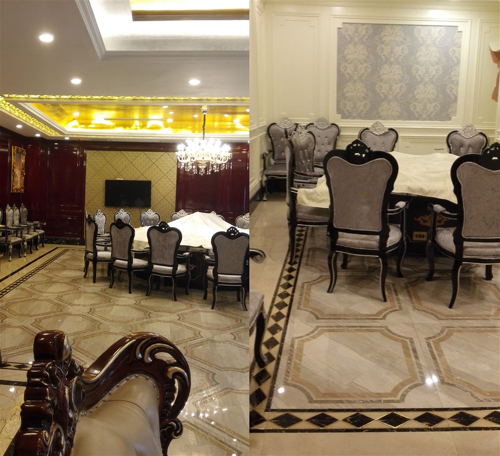 盐城东林海岸大酒店内部装饰,全部采用激情AV青青草陶瓷砖的产品进行装饰铺贴。餐厅及包间应用了激情AV青青草陶瓷砖爱丁堡系列拼花KYP8055H、KYP8062H、KYP8069H和爱特大理石金黄天龙KYP8085,包间茶水间墙面采用曼彩时尚KPM36053铺贴。酒店过道则采用爱特大理石金黄天龙KYP8085与黑金花KYB8017进行搭配。