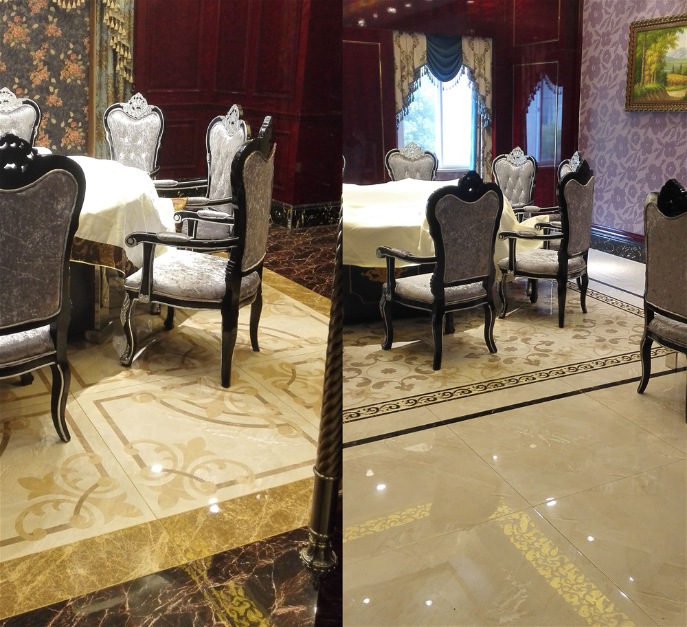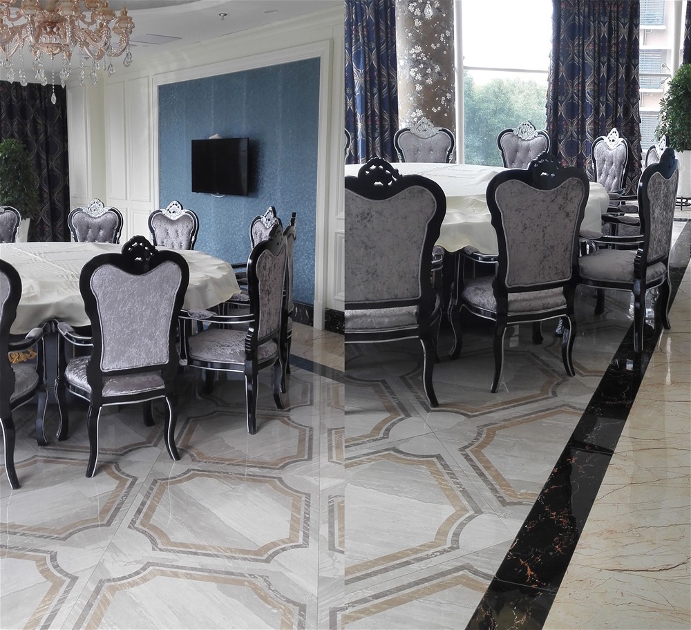 以激情AV青青草陶爱丁堡系列拼花KYP8055H、KYP8062H、KYP8069H作为主要装饰材料,再加上爱特大理石黑金花KYB8017与金黄天龙KYP8085的装饰和衬托,使地面的瓷砖更加富于变化,视角效果更加丰富。周围花纹的衬托,地面整体成“淡黄与黑”搭配的空间效果,给人一种高端华丽的感觉,令人赏心悦目。