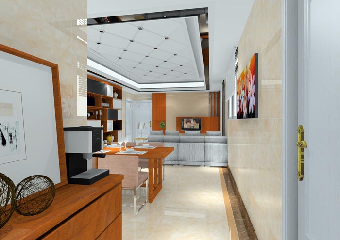 本案设计理念: 本单元是现代风格家居,色调以暖色调为主,体现温馨的感觉,造型上以直线线条为主,沙发是简约的布艺沙发,其他的家具以板式家具为主,厨房空间与餐厅空间采用开放式通透的方式,营造出精致时尚生活空间。