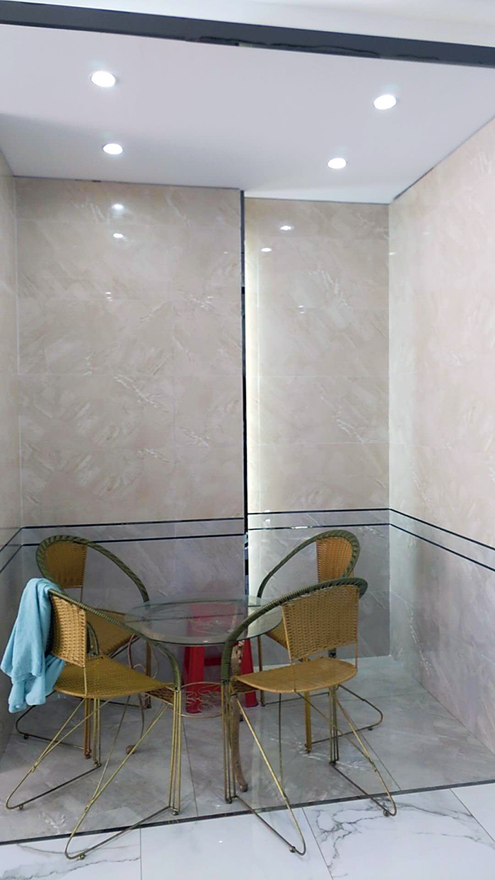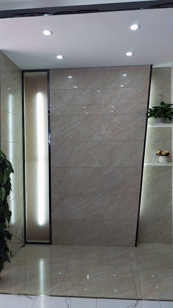 金属条的运用,将整个空间纵向、横向分割,将产品的深浅铺贴分割的更加明显。