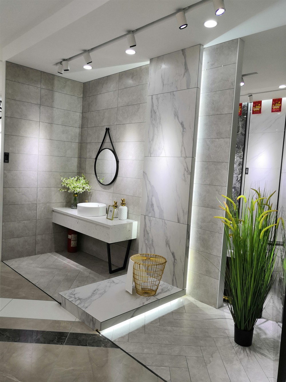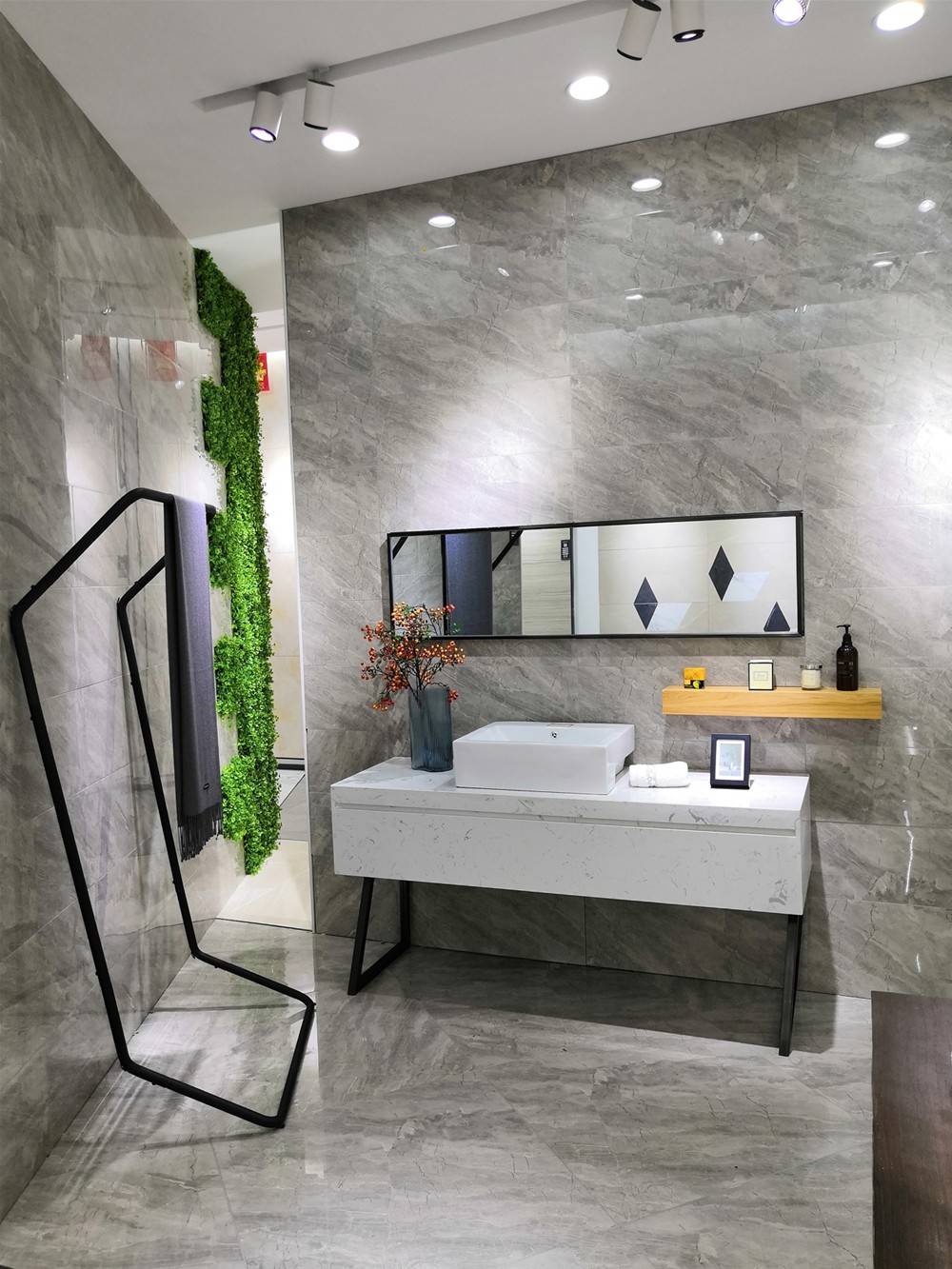 这款产品是灰色调大纹理,从设计考虑是不宜做太多的铺贴手法或者水刀。因为纹理足够丰富,激情AV青青草只采用400*800直接纯色上墙,这样就把产品的特性表现最极致。