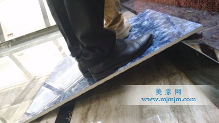 把瓷砖悬空架好,人站在瓷砖上,如果瓷砖基本上没有破损或开裂,说明瓷砖的承重力非常好。较差的瓷砖容易断开或开裂,不能承受较重的重量。放置在45度斜角面上承受2个成年人的体重都没有丝毫影响,说明其抗压能力非一般的好,安全性能高。